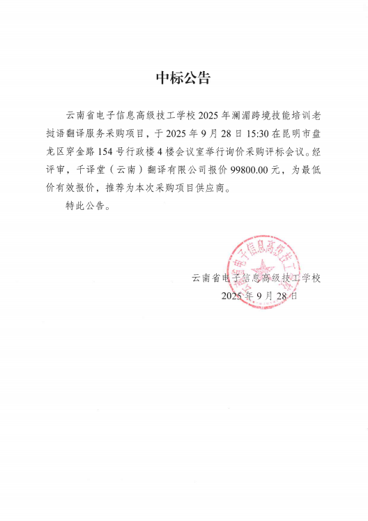 2025年澜湄跨境技能培训老挝语翻译服务采购项目中标公告